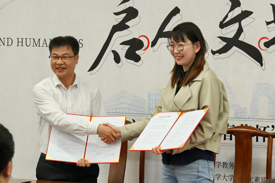 典礼上,tt1069 党委副书记王用源代表tt1069与百味年华编辑部总经理孟佳就院企合作、共建学生实习基地进行签约。