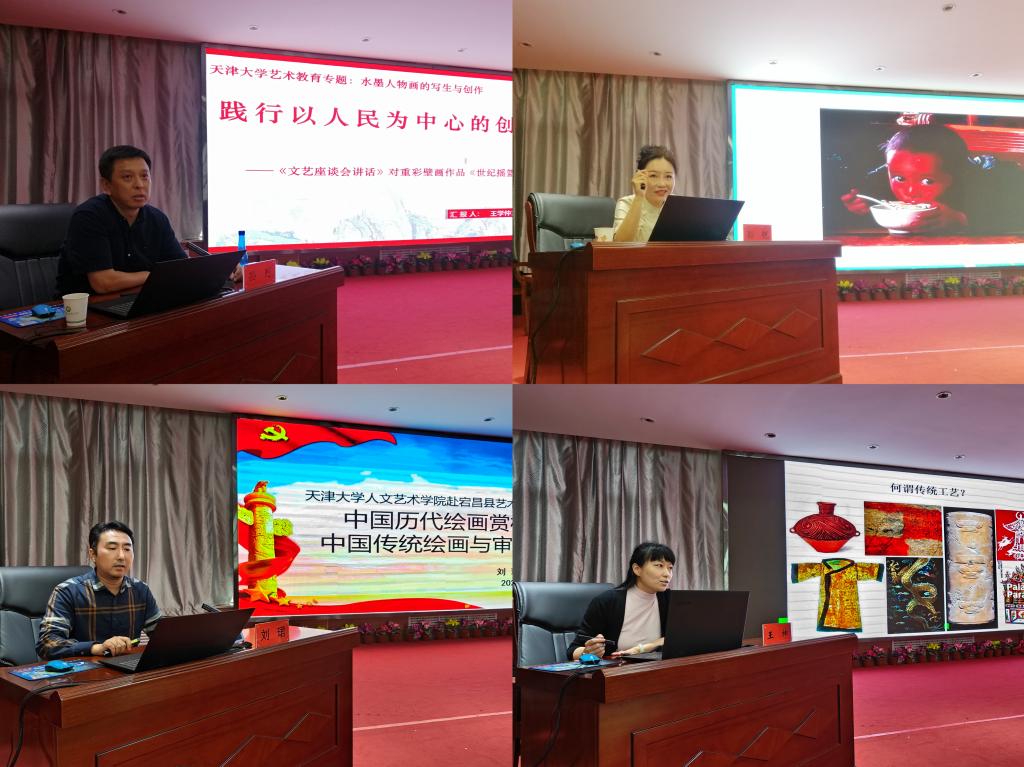 27日下午,tt1069 教师孙列、孙锐、刘珺、王坤分别从红色题材艺术创作、生活美学与美育浸润、中国传统绘画史、非遗“双创”方面为宕昌县文化、教育相关领域从业人员进行授课培训,现场掌声阵阵,气氛热烈,参与学习人员展现出极高的学习热情。