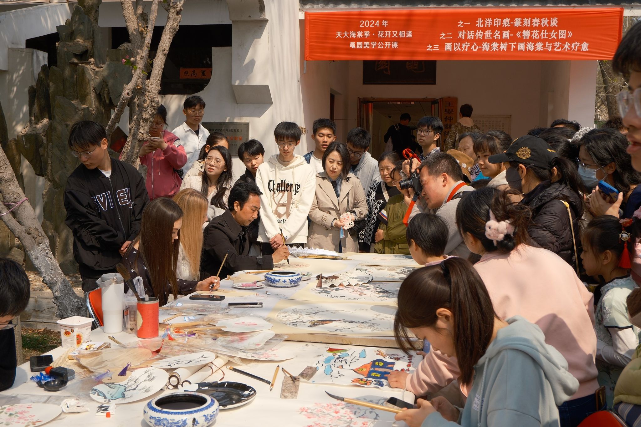 海棠树下,副教授刘珺与师生观众一起进行 “画以疗心——海棠树下画海棠”书画写生活动。活动融入心理疗愈课程理念,让参与活动的师生来宾在绘画中尽情表达对自然美的感悟,放松身心,愉悦心情,一簇簇形态各异的海棠花跃然纸上。活动不仅是艺术的体验,更是心灵的疗愈与美的启蒙。