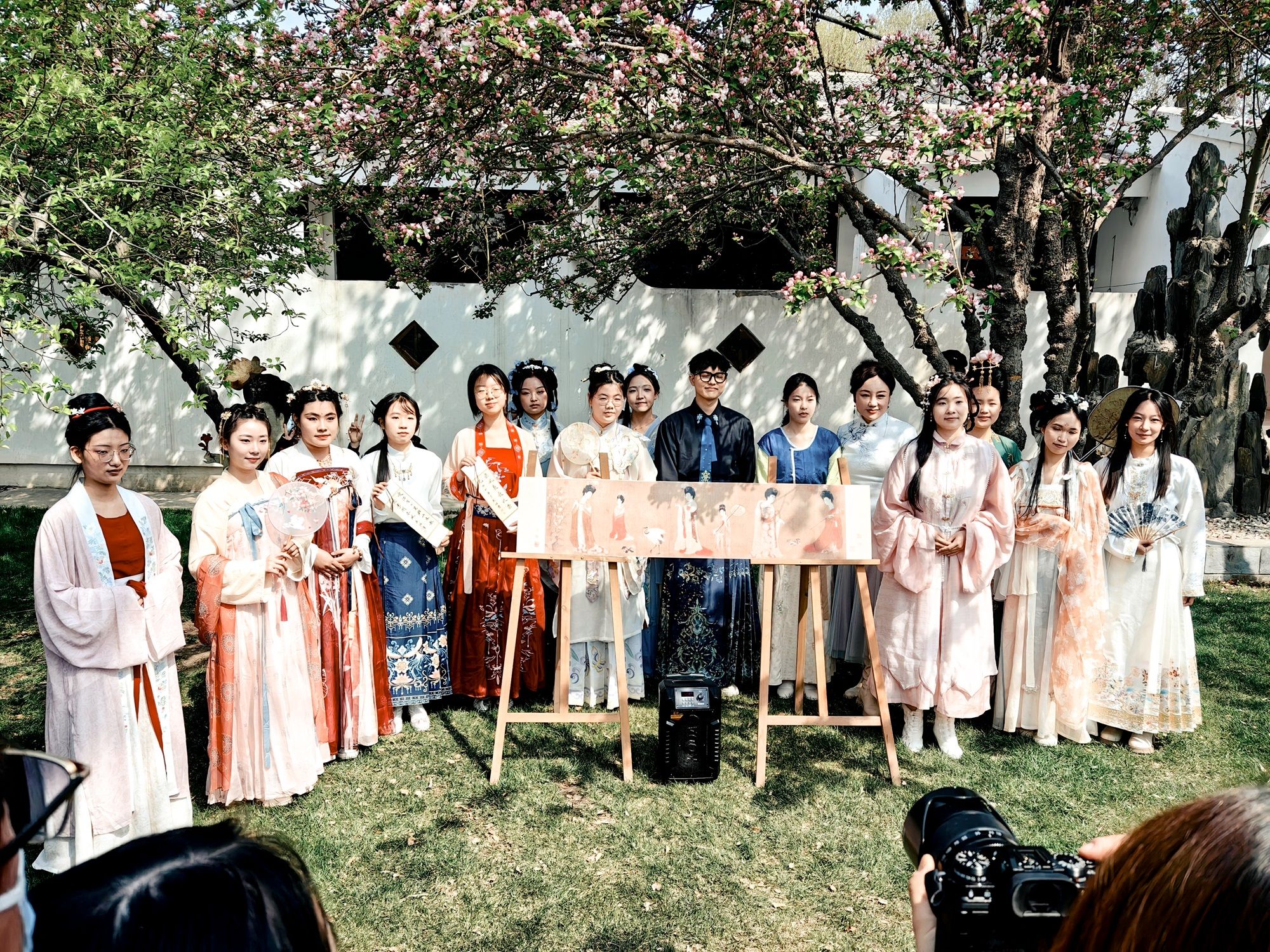 黾园外草坪上,“情境再现—中华经典名画《簪花仕女图》汉服荟”更是将人们带回了古代华丽的汉服之中,以情境再现的形式展现了中国传统服饰之典雅。副教授孙锐为师生观众讲解中国画经典《簪花仕女图》,带领汉服社的同学们以穿越形式再现簪花仕女游春盛境。观众们穿着汉服,与唐装美人同框留影,现实与历史互动,共同体验中华传统文化的魅力。