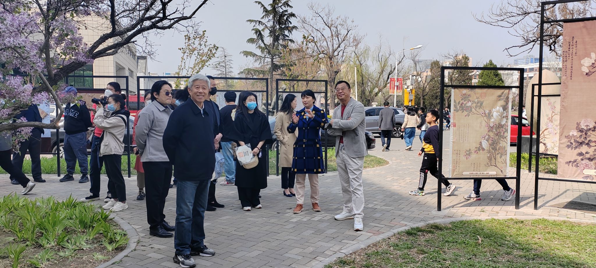 在工笔重彩研究所门前的口袋画廊,伴随海棠花的盛放以及丁香花的芬芳,“花与画:历代海棠名画展”的专题展览呈现出跨越时空的美感。工笔所的师生们带领师生观众共同欣赏历代以海棠为主题的名画佳作。画上的海棠花或含苞待放,或明艳盛开,或浓丽湿润,或明快清雅,无不洋溢着春的氛围。