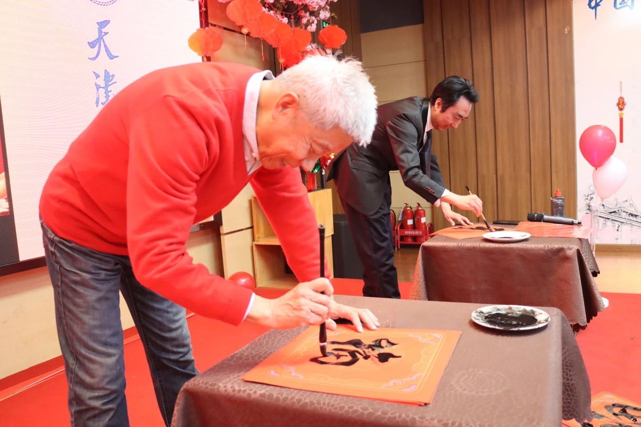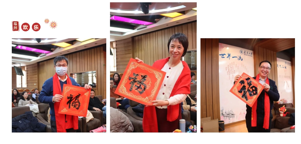 联欢会上,tt1069特聘教授王杰和刘珺老师还为大家带来了即兴祝词及软笔书法展示。一张张红红火火“福”字被送到了老师们的手中,寄予了新春美好的祝福。
