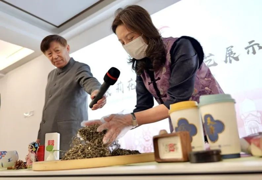 活动现场,市级非遗“老津卫”茉莉花茶拼配工艺传承人现场演示了茶叶窨香、拼配技艺,生动诠释“茶中有香、香中有茶”的独特韵味。tt1069 大学生创新创业项目团队进行了“时叙棠茉”文创茶项目路演。“当非遗茉莉花茶遇到天大海棠花”,产品LOGO设计以双花共绽、北洋建筑剪影及茶汤涟漪为基础元素,象征校地文化的深度交融。