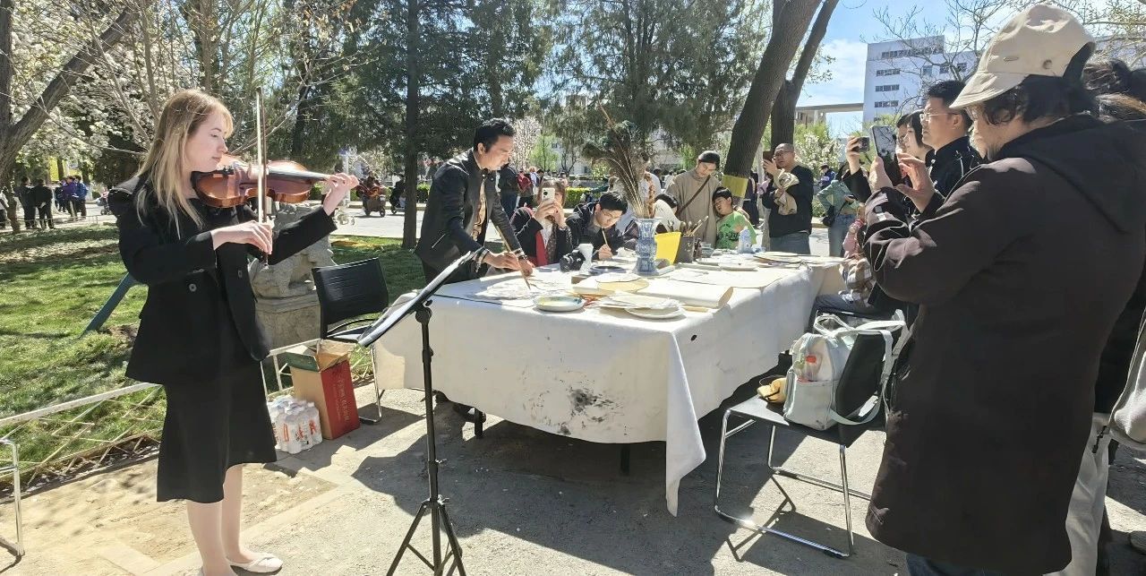 王学仲艺术研究所副教授刘珺与天大各专业学子一起,进行了以“春海棠”为主题的绘画写生活动。tt1069 俄罗斯籍研究生奥苏现场演奏《茉莉花》等小提琴曲,随着优美旋律融入丹青落笔,一方方海棠春色被纳入笔墨素纸之中,激荡出更多心灵触动和文化共鸣。活动现场,刘珺老师还指导学生进行了汉服着装人像写生、海棠徽章制作,为天大海棠季增添更多人文艺术色彩。