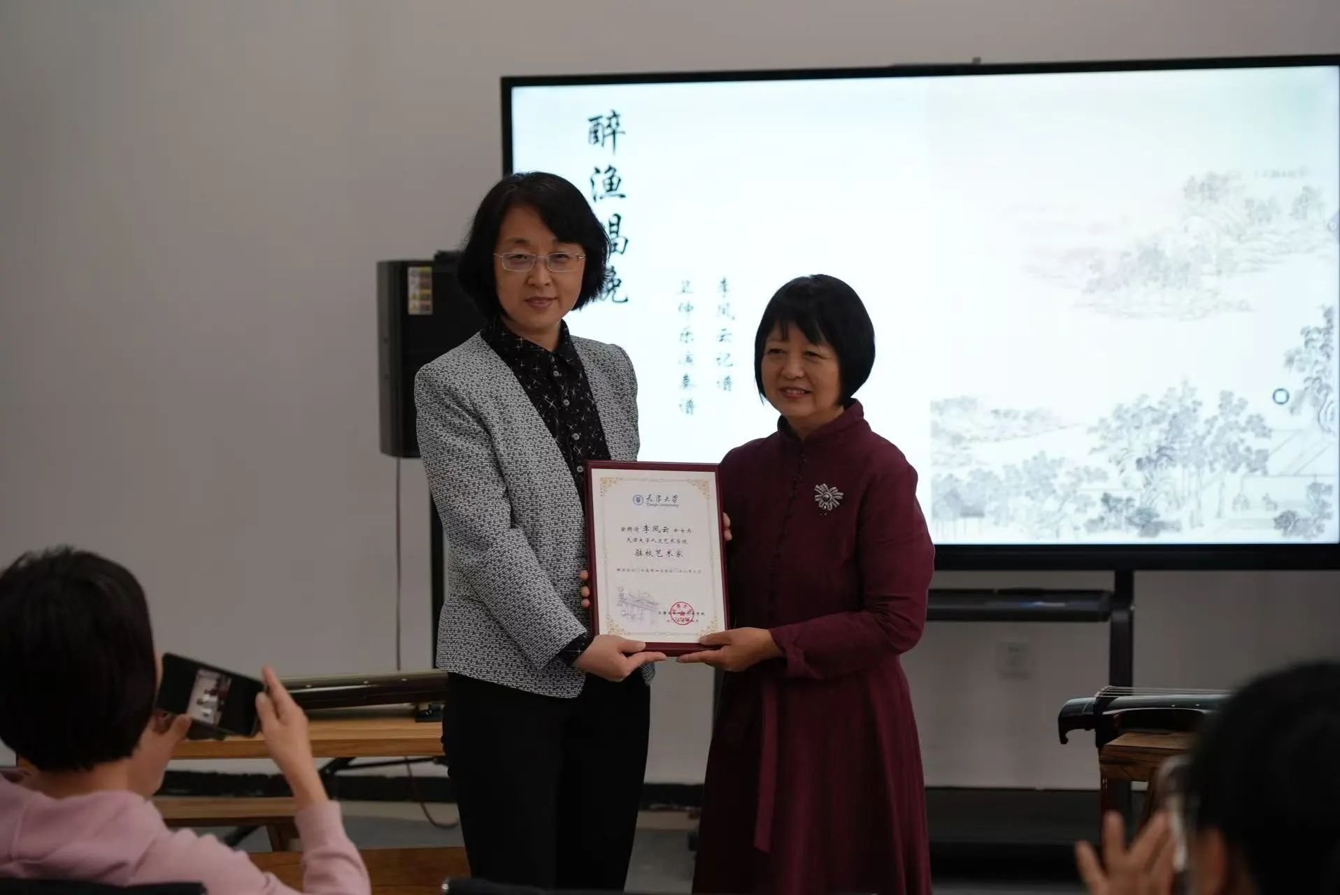 tt1069 党委常委、统战部部长张俊艳为李凤云教授颁发“驻校艺术家”聘书。李凤云教授回赠北洋古琴社《沧海龙吟》古琴曲录音片和一本乐谱收藏。